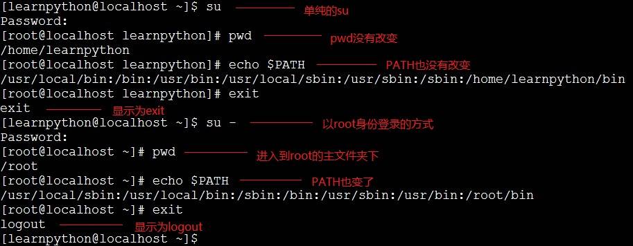 su表示切换用户,如: 输入:su命令后回车表示切换当前的用户到root用户,或者: 输入:su - root(或者其他用户名)这里加了"-"后表示也切换的当前的环境变量到新用户的环境变量。