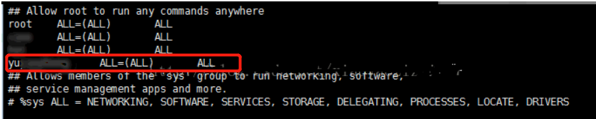 然后在打开的文件里把你的用户名加上去(按照里面已有的用户的格式来填:username ALL=(ALL)ALL)