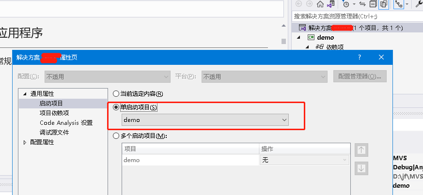 具体操作:解决方案---》右击选择属性----》点击启动项目---》选择但启动项目,点击确认