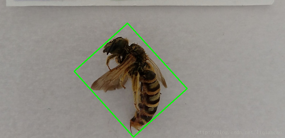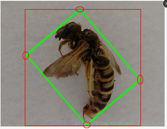 step7:裁剪。box里保存的是绿色矩形区域四个顶点的坐标。我将按下图红色矩形所示裁剪昆虫图像。找出四个顶点的x,y坐标的最大最小值。新图像的高=maxY-minY,宽=maxX-minX。