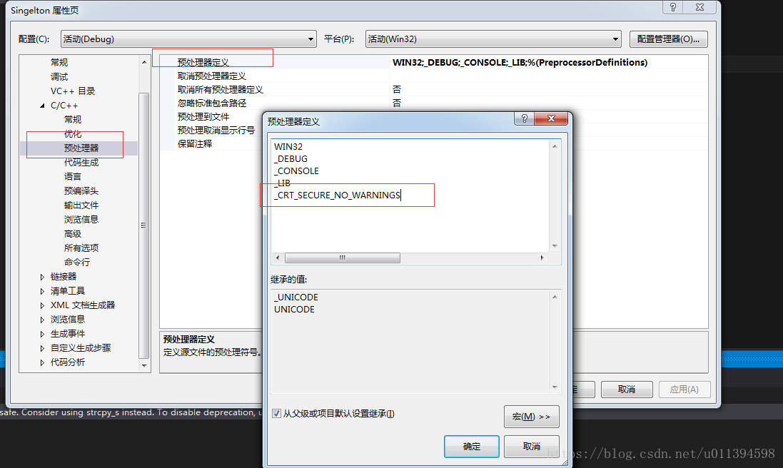 解决方法是:找到【项目属性】,点击【C++】里的【预处理器】,对【预处理器】进行编辑,在里面加入一段代码:_CRT_SECURE_NO_WARNINGS。
