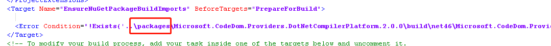 解决方法是:打开CSPROJ文件。将:两处“..\packages\”改成新的本地packages路径(我的是..\..\CommonPackages)即可。