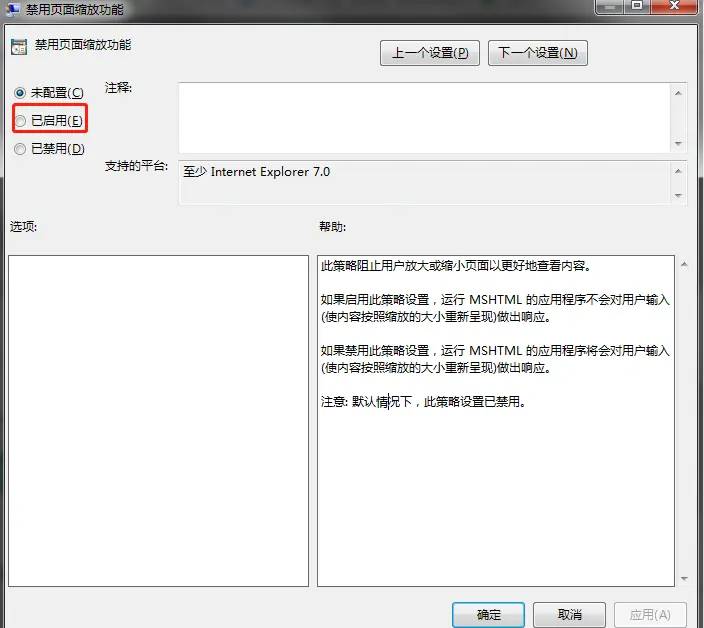 在右侧的窗口中找到“禁用页面缩放功能”,然后双击打开。将其状态设置为“已启用“。